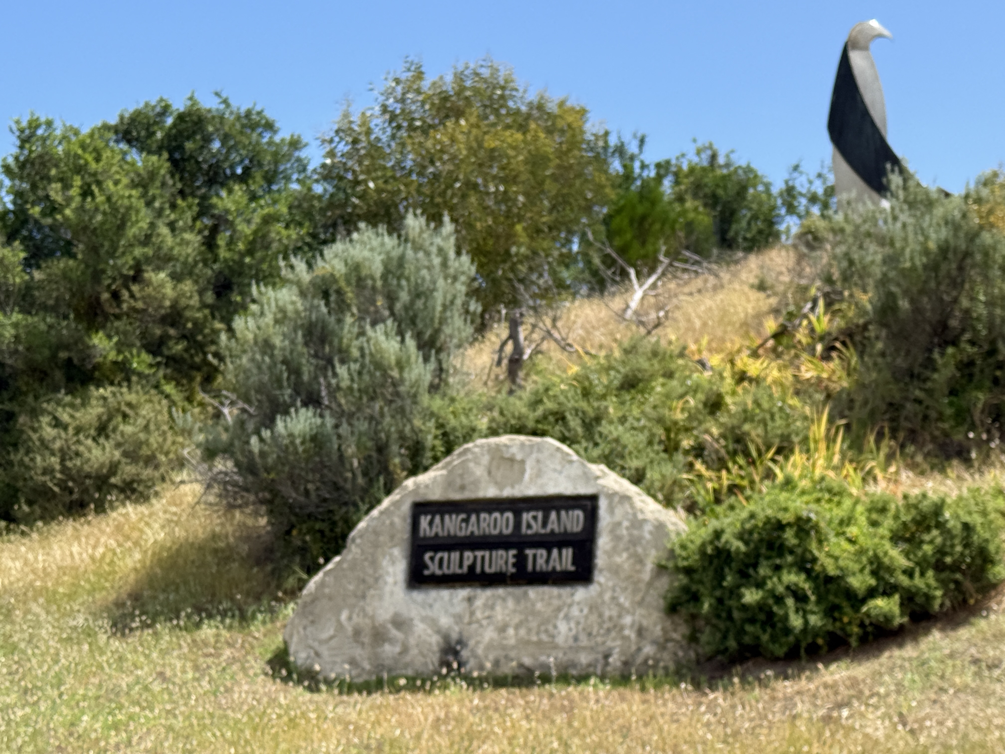 Penneshaw: Sculpture Park: name plate ("grounded guardian" in background)